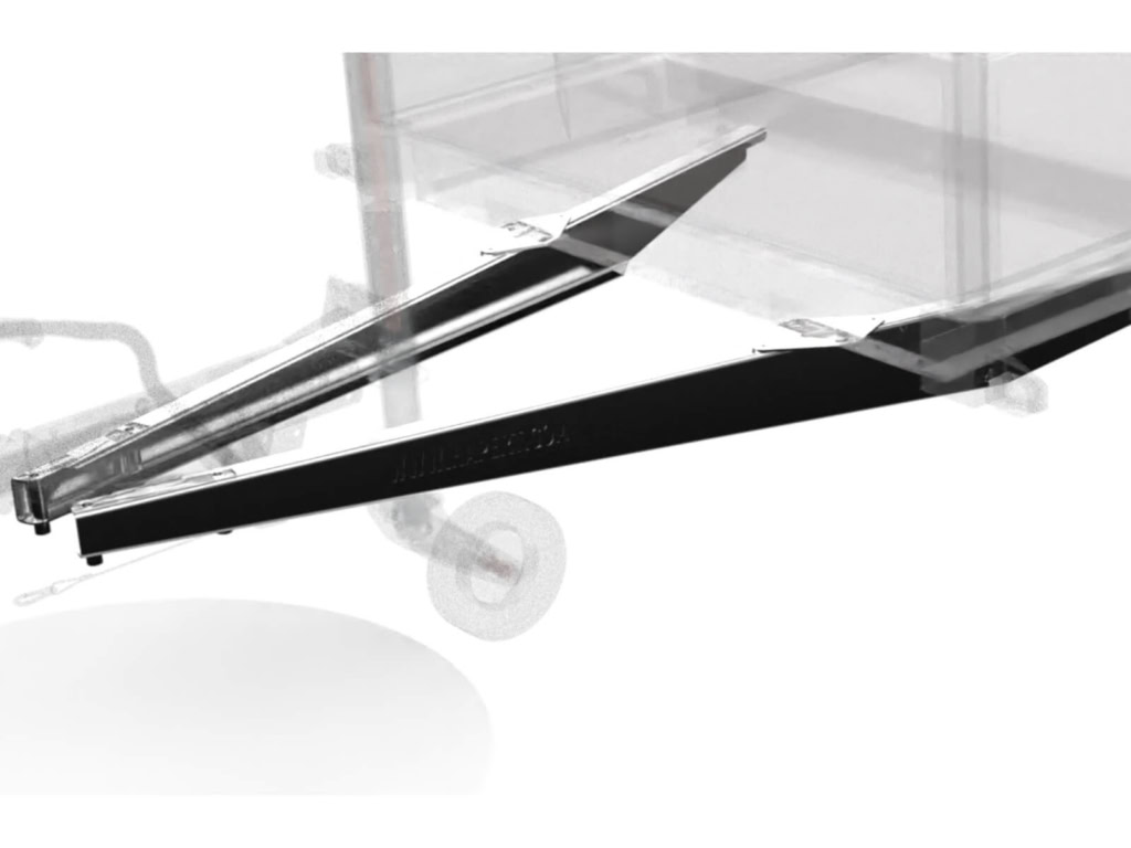 • Set oprijplaten in houder onder aanhangwagen + 2x steunpoot + zwengel (oprijplaten 2.50m aluminium 2350 kg draagvermogen)